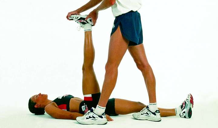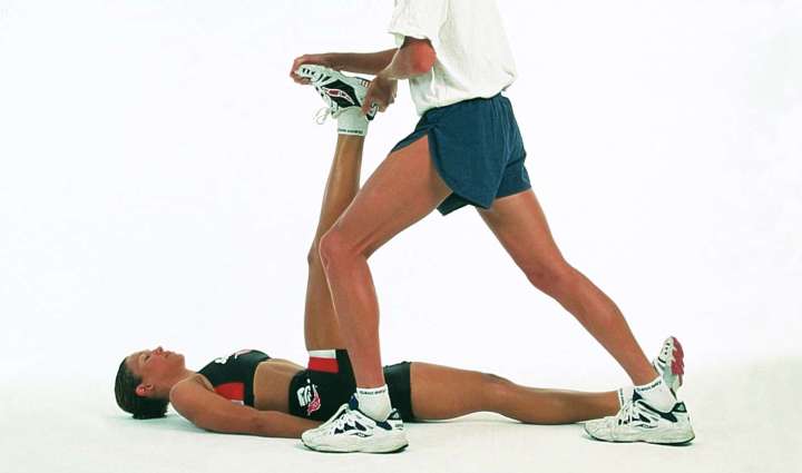 To execute the stretch, the athlete and their partner assume the position shown. The partner gently lengthens the athlete’s limb until the desired muscle stretch and tension are reached.